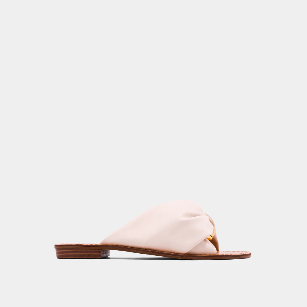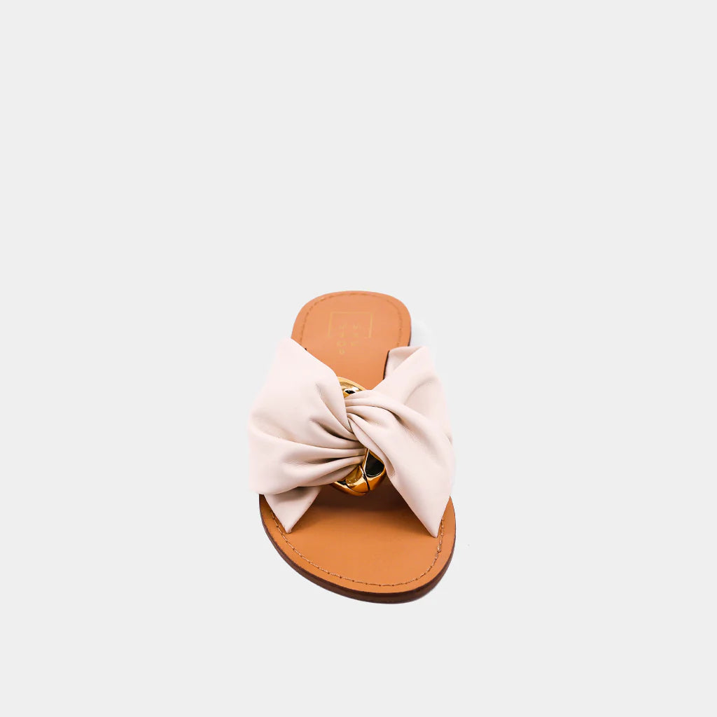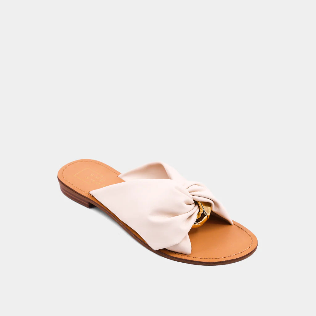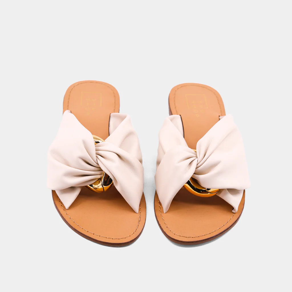 Soft, sculptural, and endlessly chic. The DAWN sandal in Bone features a knotted draped design in smooth faux leather, giving it a modern yet effortless elegance. Its sleek, flat sole and natural stitching create a polished finish, making it the perfect slip-on for warm-weather styling.