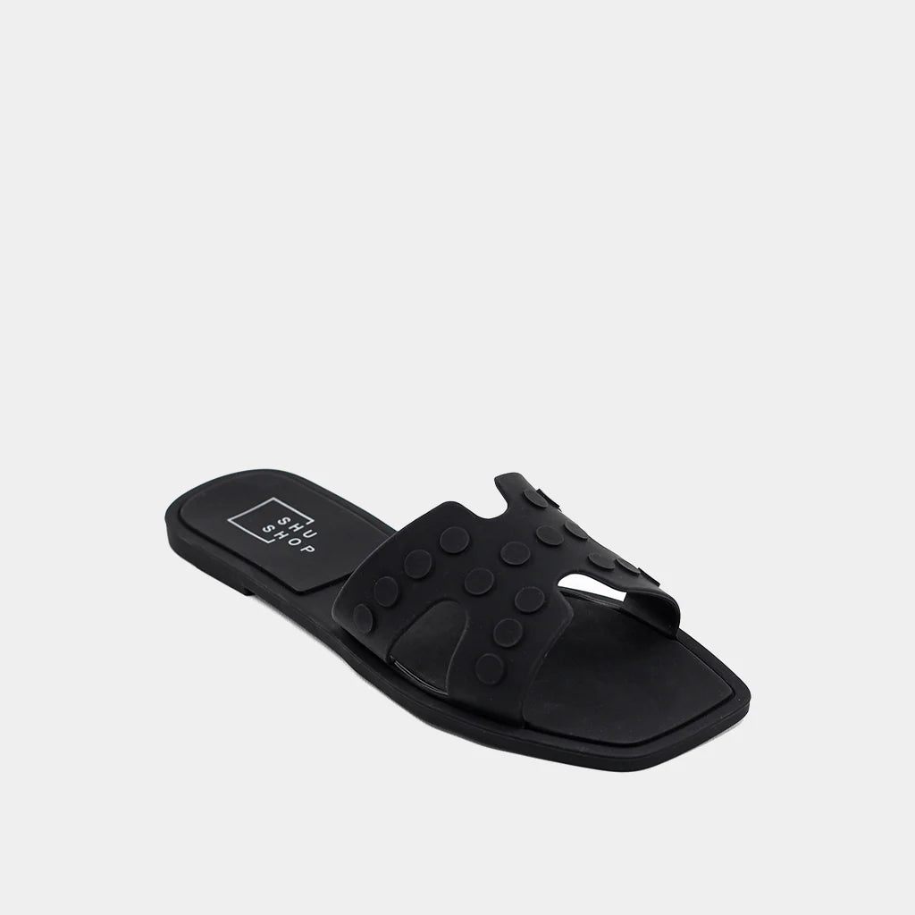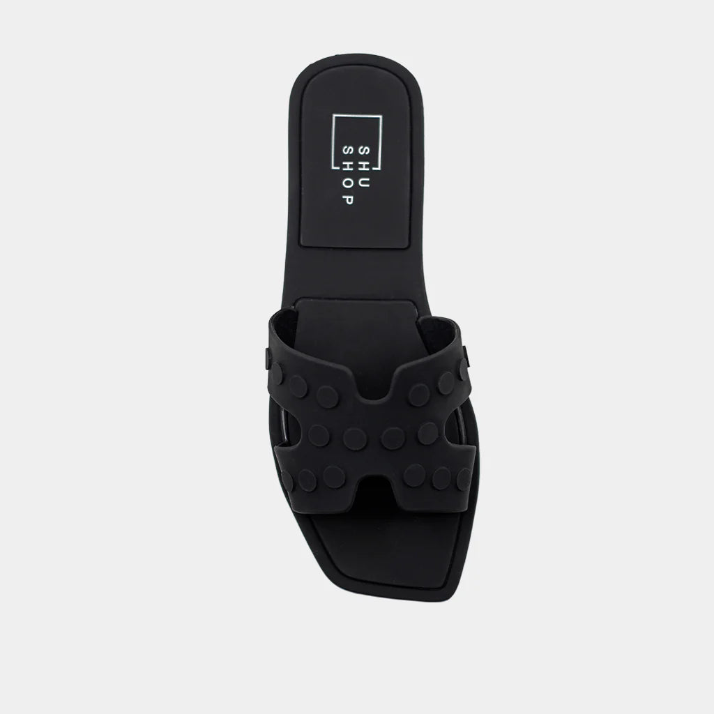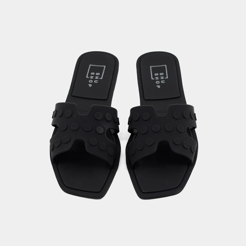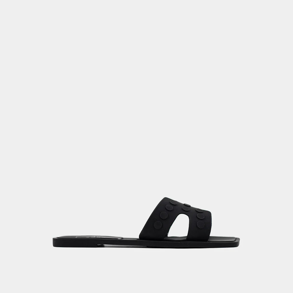 Sleek, minimal, and effortlessly coolthe DONNA slide in Black is a modern essential. Made from soft, flexible rubber, its sculptural cutouts and raised stud accents add a contemporary edge while keeping things ultra-comfortable. Whether you're at the beach or styling it with streetwear, this jelly-inspired sandal is a must-have