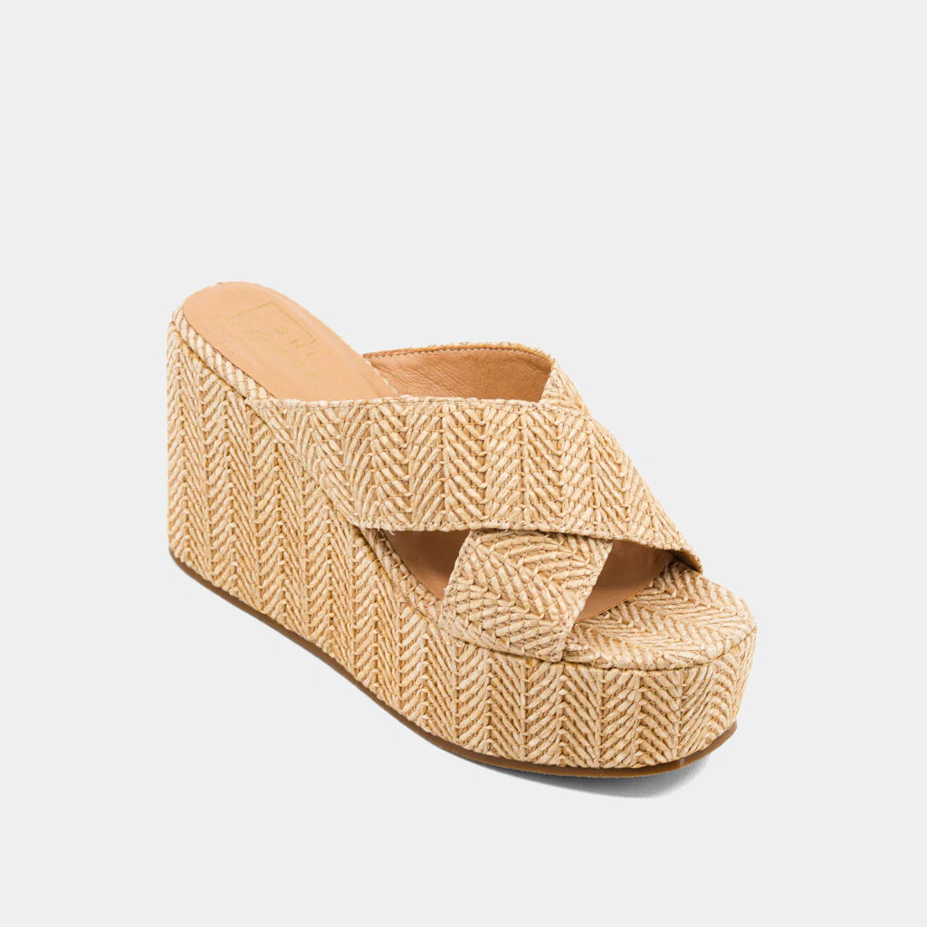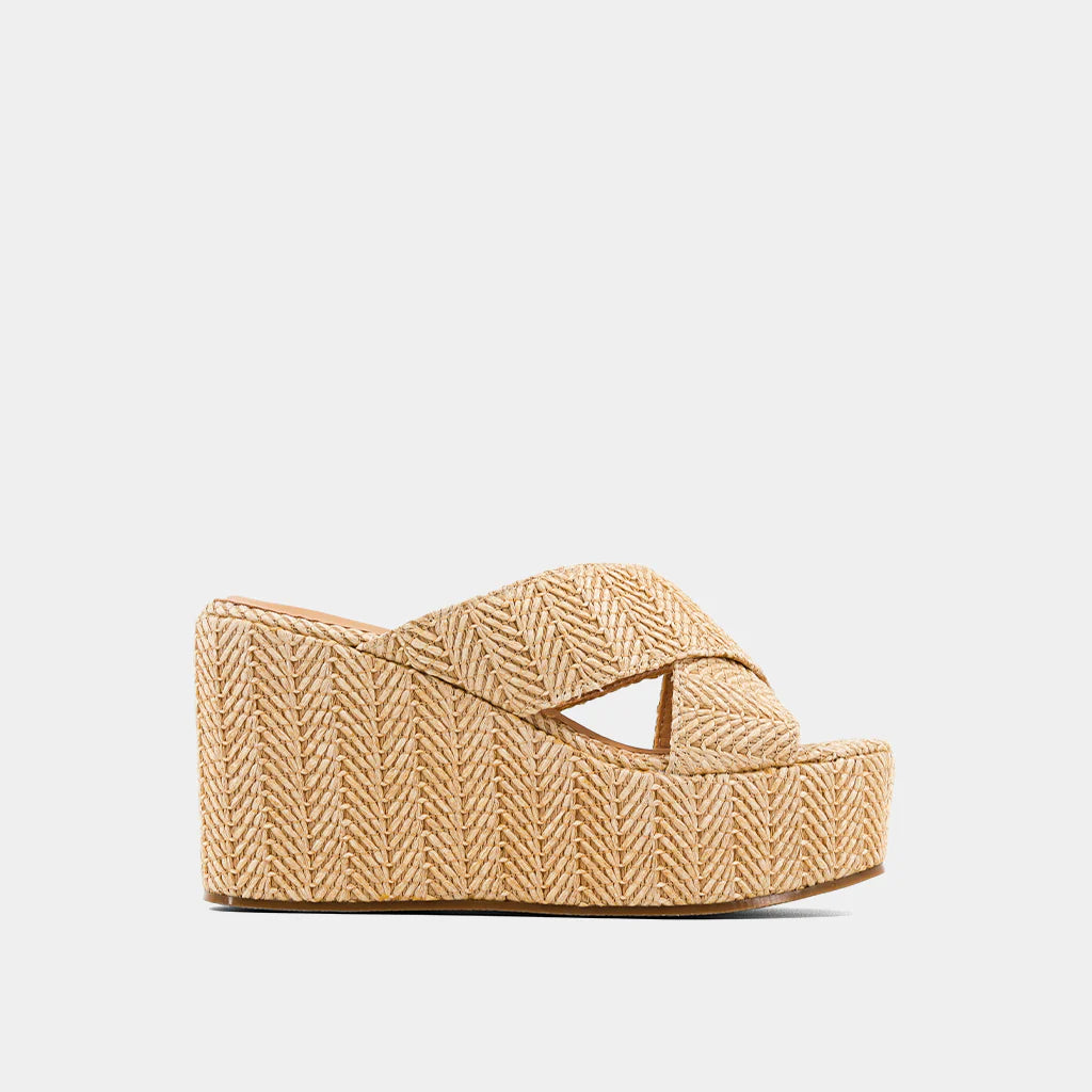 Elevate your summer wardrobe with LUDOVICA in natural woven raffia. Designed for maximum impact, this platform wedge features a soft, neutral-toned woven upper that exudes bohemian elegance. The wide crossover straps offer a secure fit, while the soaring sole gives you the height you crave without compromising comfort. Pair it with flowy dresses or linen sets for a sun-kissed, effortlessly polished look.