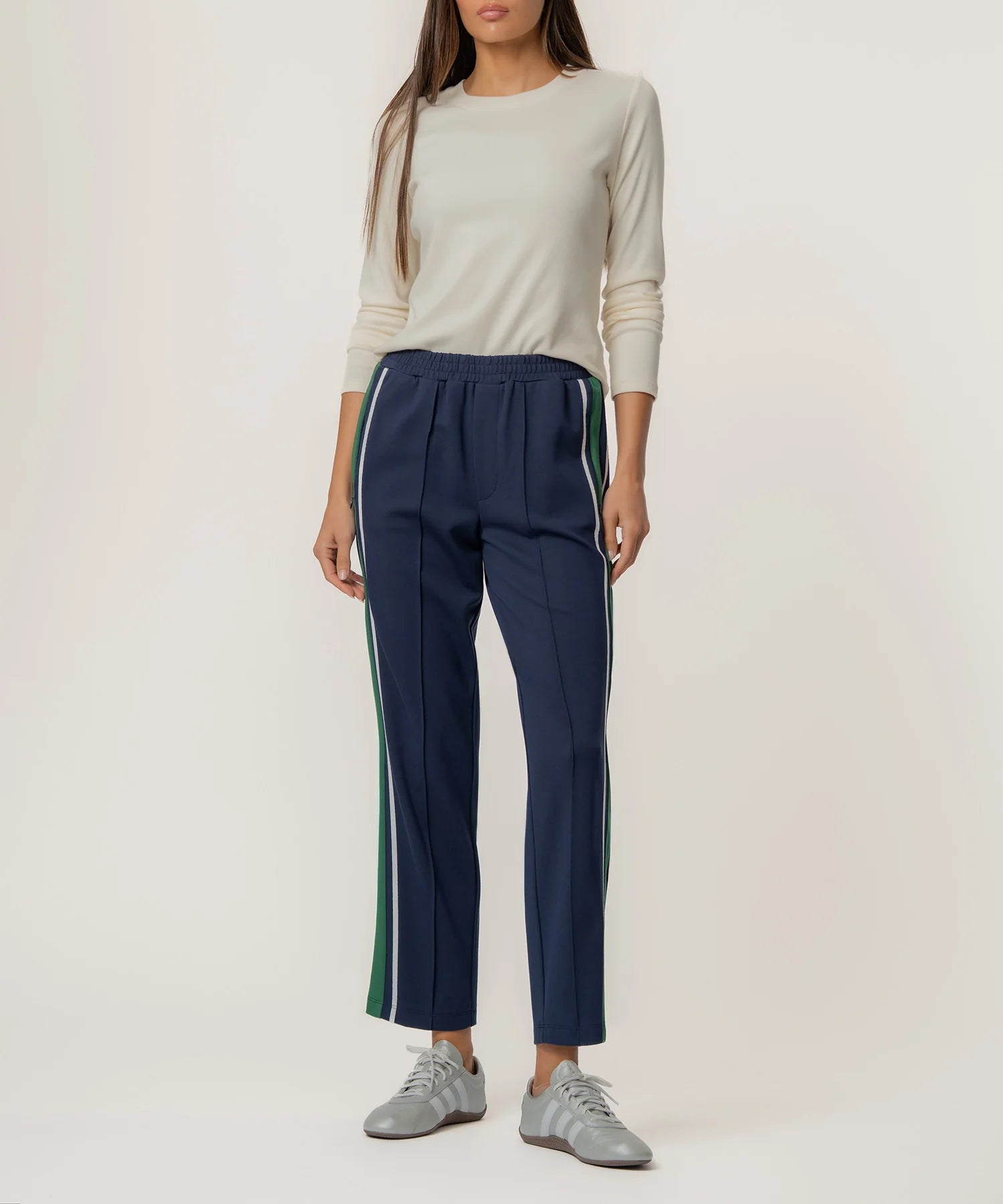 These straight leg pants combine comfort and style with an elastic waist and sleek side seam pockets featuring invisible zippers. Side contrast lines add a modern, sporty edge to the clean silhouette. Perfect for both casual and elevated looks, they’re a versatile wardrobe staple.