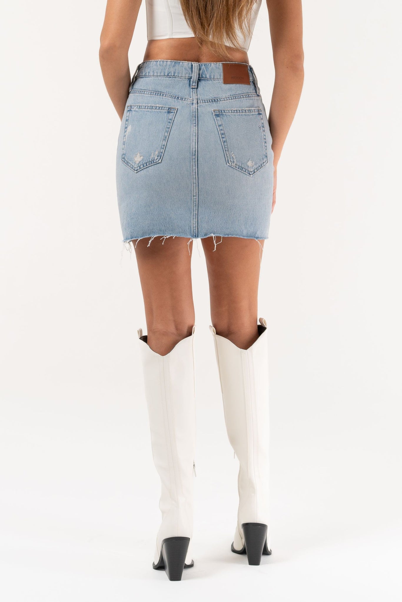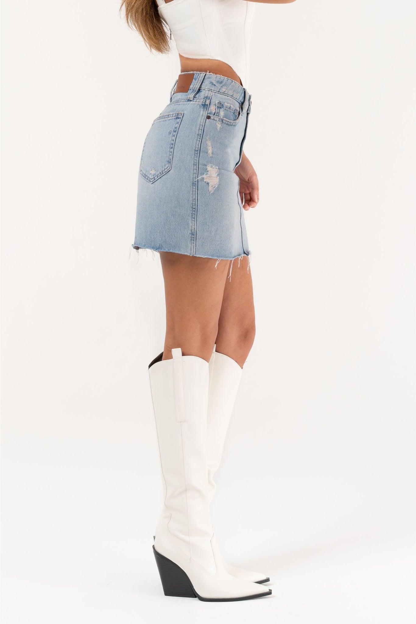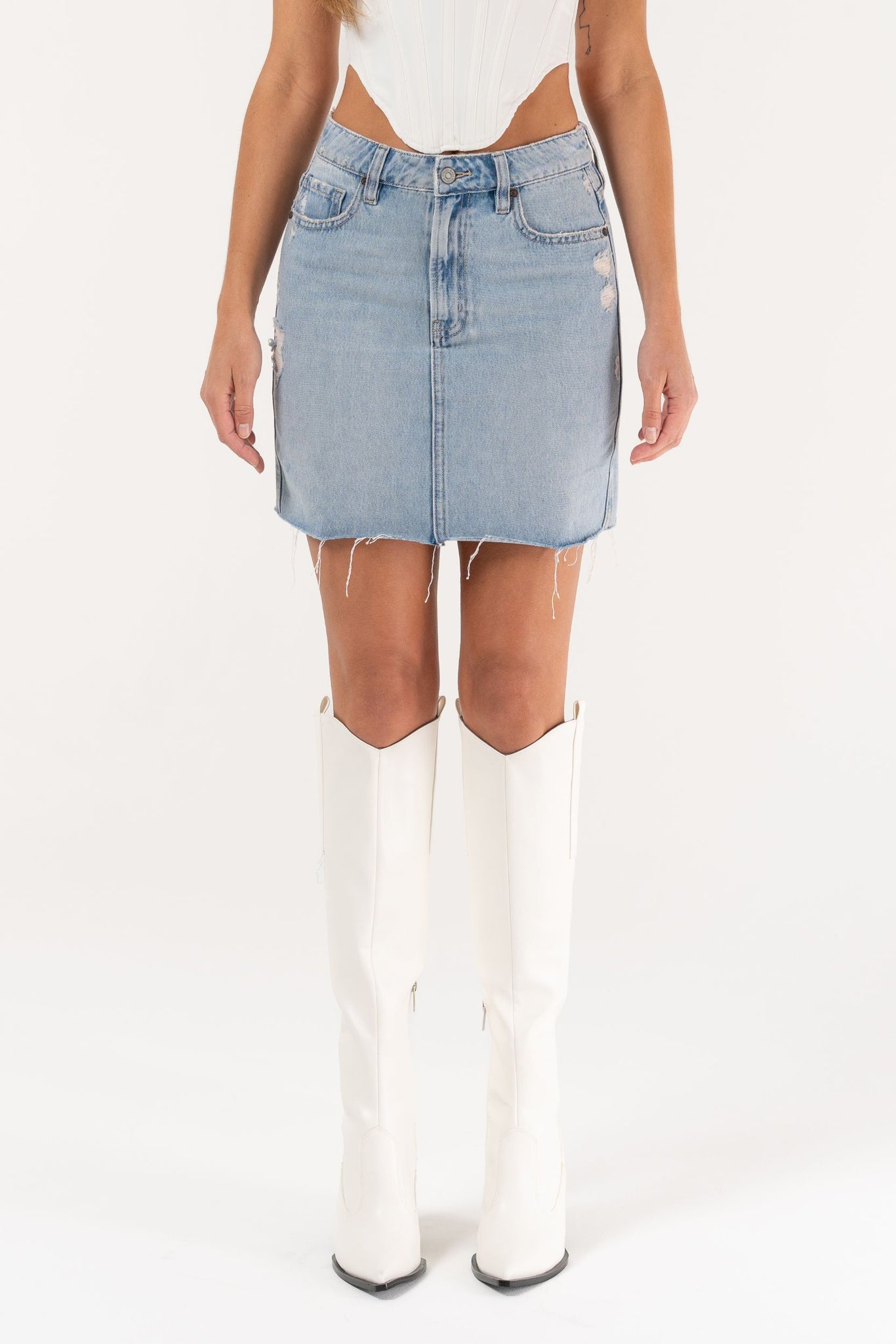 This light wash denim skirt brings a fresh twist to your wardrobe with its playful high-rise fit and subtly distressed details. The raw hem adds a carefree edge, perfect for sunny days and casual adventures. Easy to pair and effortlessly cool, it’s your new go-to for a fun, flirty look.
