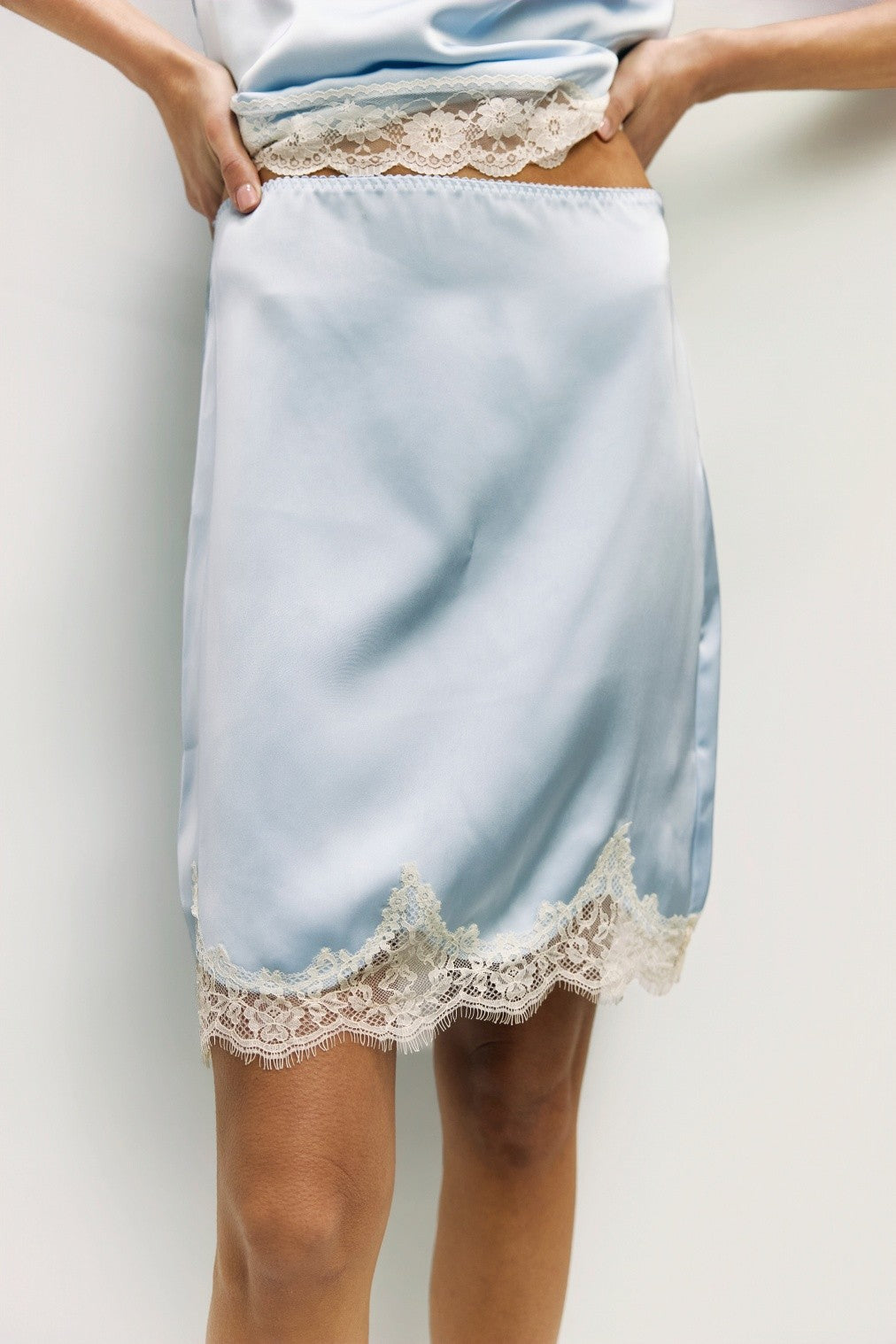 The Ayla Skirt is crafted from midweight satin with a relaxed fit, featuring a mini-length silhouette, elastic waistband, and delicate bottom lace trim, and pairs effortlessly with the Sera Top or a cute oversized sweater