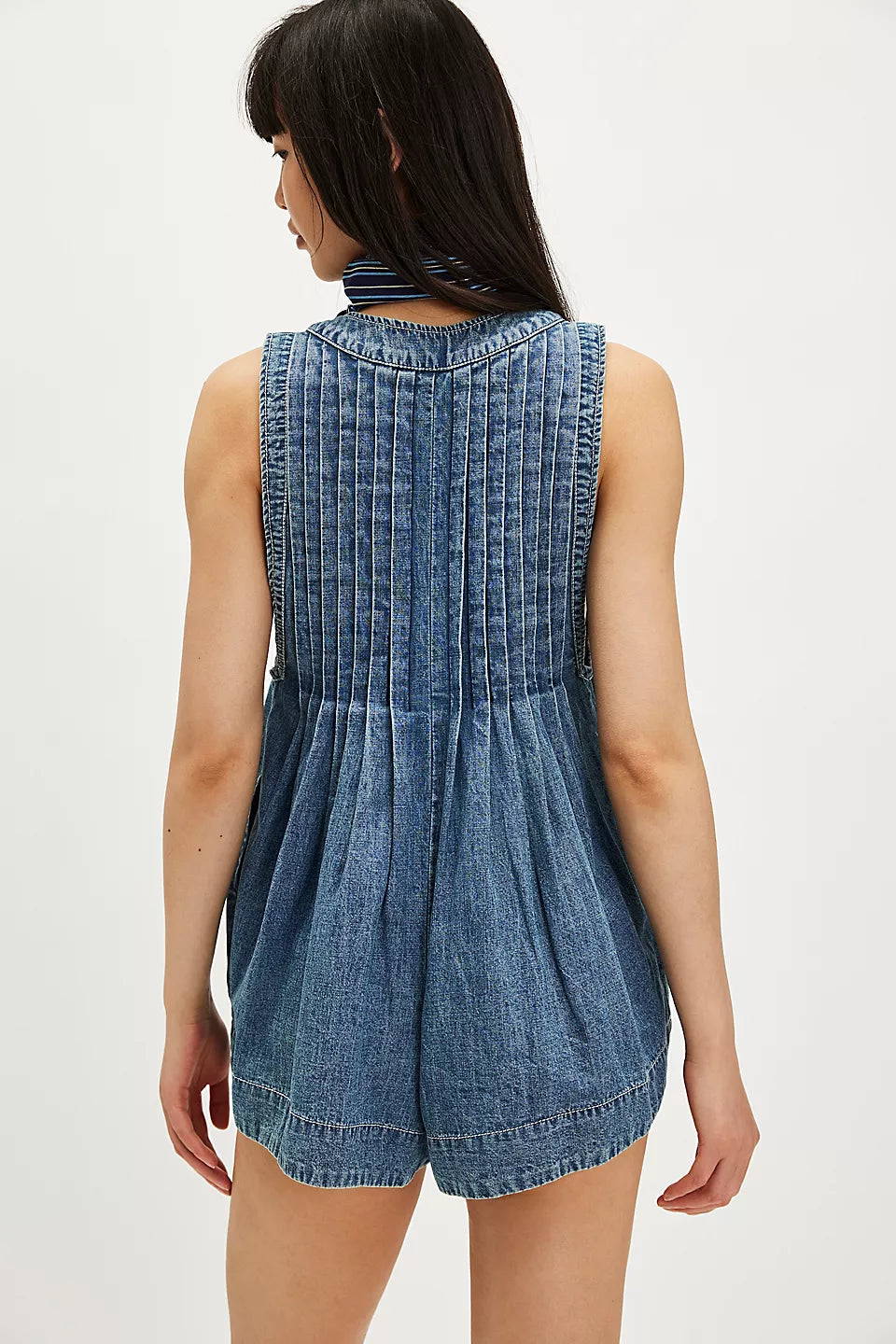 Totally timeless in a relaxed, ready-for-anything design, this staple romper is featured in a soft, denim-inspired design with pleating throughout and tie detail at front for added dimension.