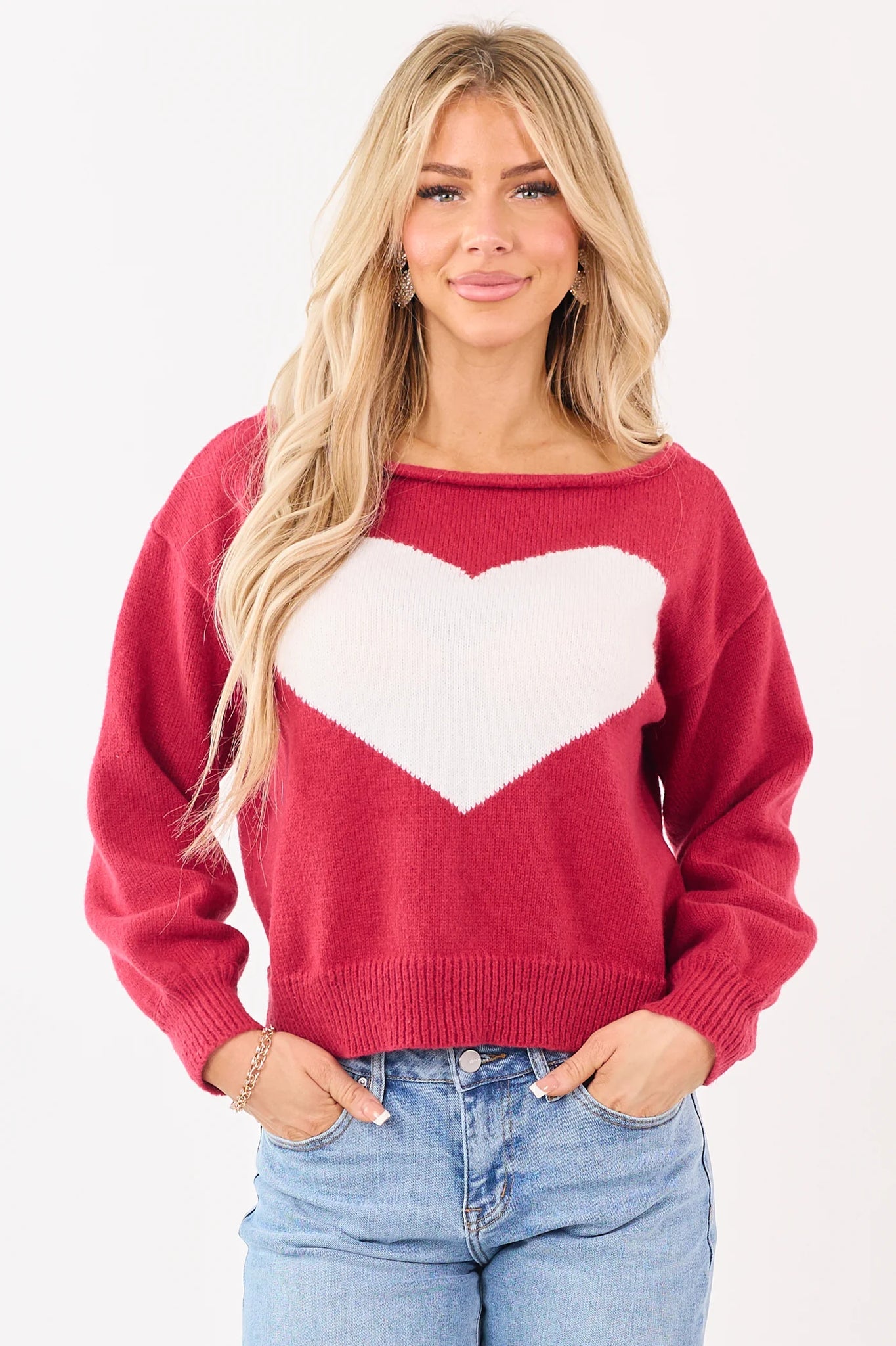 Designed to drape effortlessly off the shoulder, this ribbed sweater blends a playful heart graphic with cozy texture for chic, casual styling