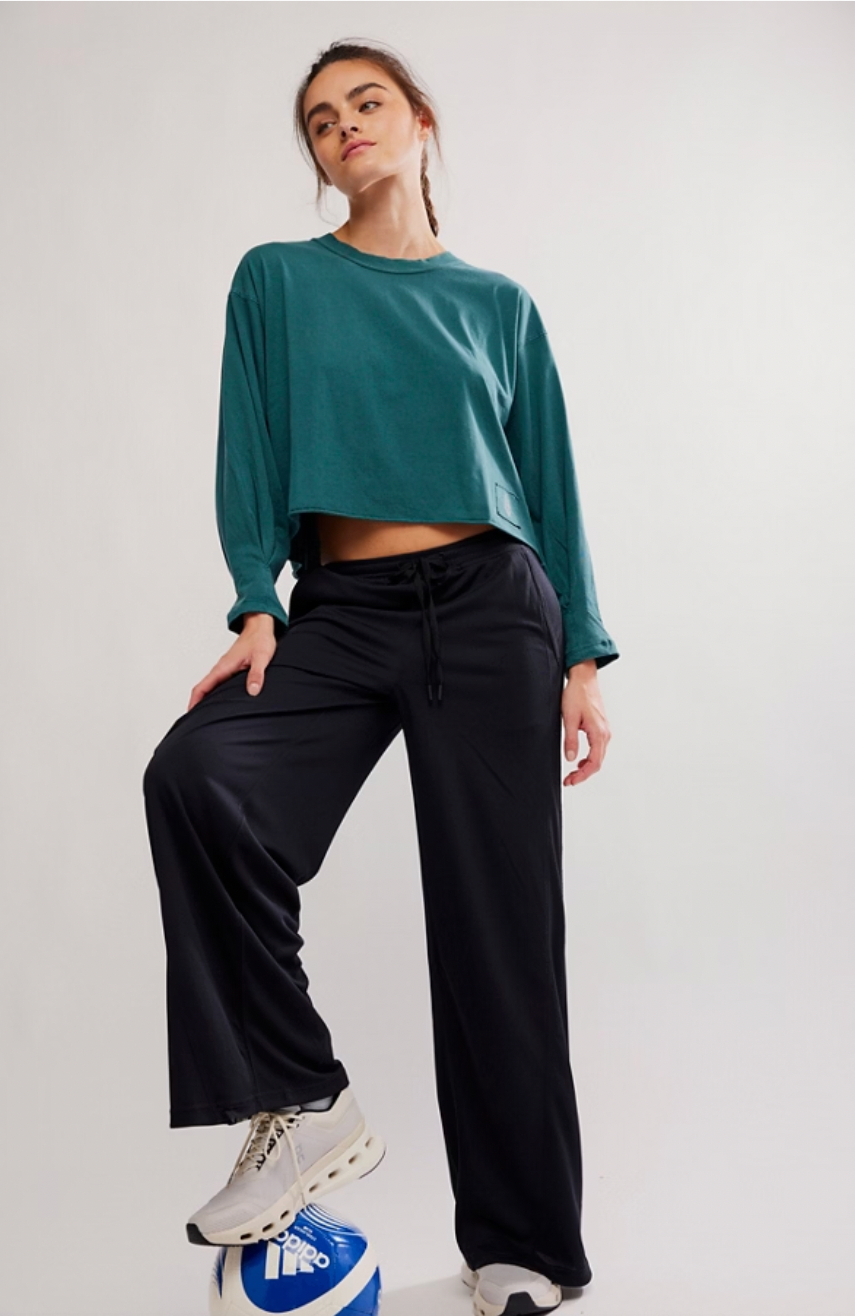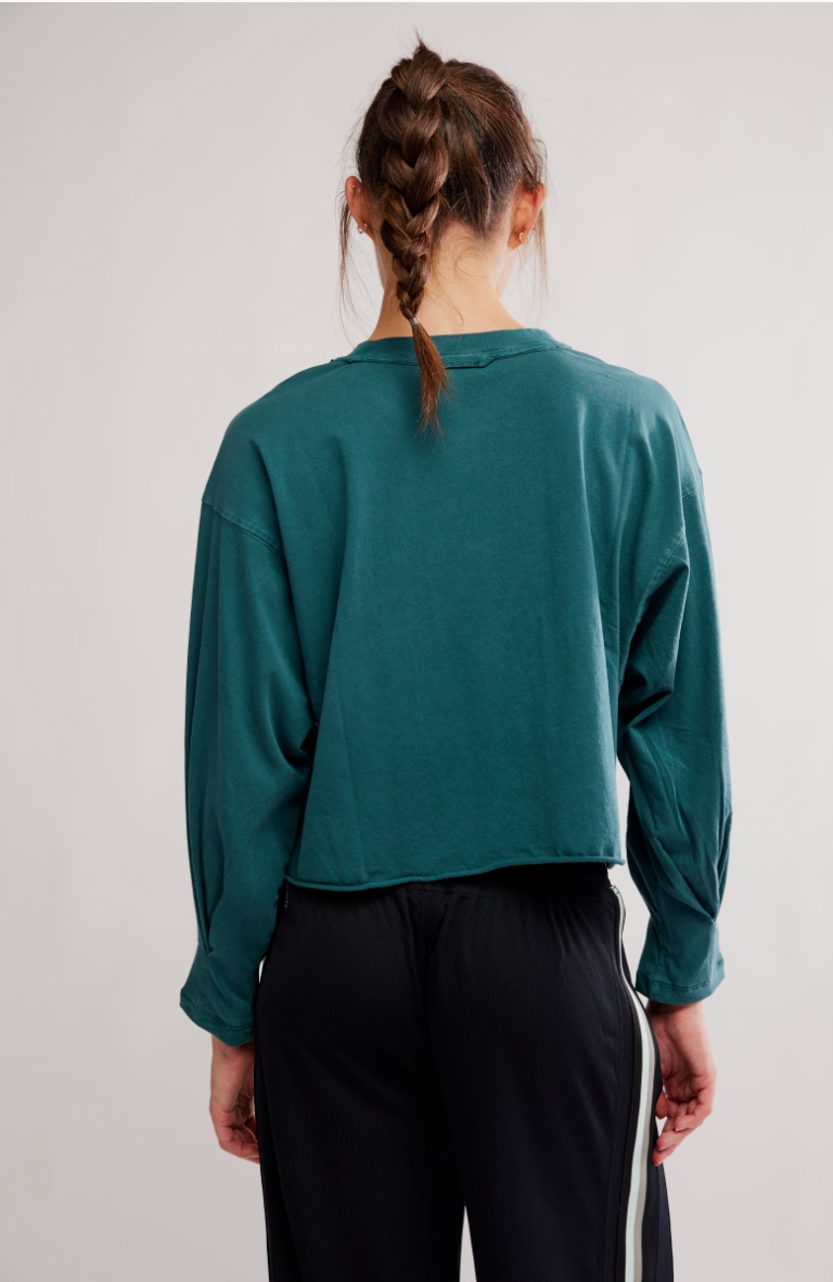 Warm up or cool down in this essential long-sleeve, featured in a boxy silhouette and slightly cropped fit with a classic crew neckline and raw-edge trim.