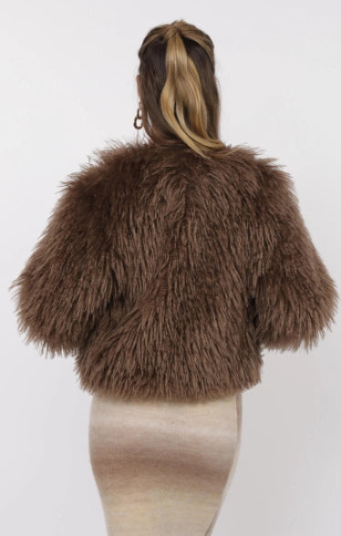 Wrap yourself in cozy luxury with this statement-making faux fur jacket. Designed in a rich deep brown shade, it features a plush, shaggy texture that adds instant glam and warmth to any look. The cropped length and relaxed silhouette make it easy to layer over dresses or denim, while the voluminous sleeves bring a chic, elevated touch. Perfect for a night out or dressing up your everyday style, this jacket will keep you warm while turning heads.