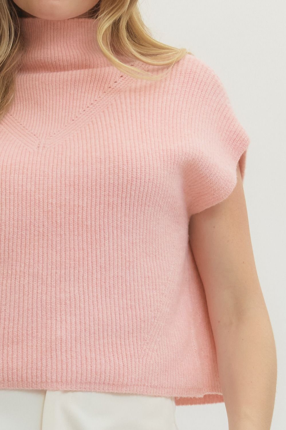 Solid cap sleeve mock neck sweater knit top featuring rib texture