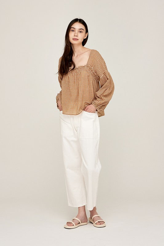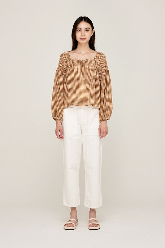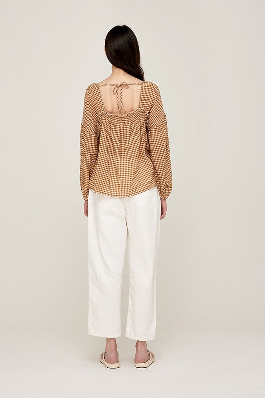 The Maria Top - a playful pick with a checkered gingham print and a flirty ruffle detail across the chest. The scoop back with a tie adds a touch of charm, while the elastic sleeves with ruffles keep it fun and flouncy. A quirky and fun addition to your wardrobe!