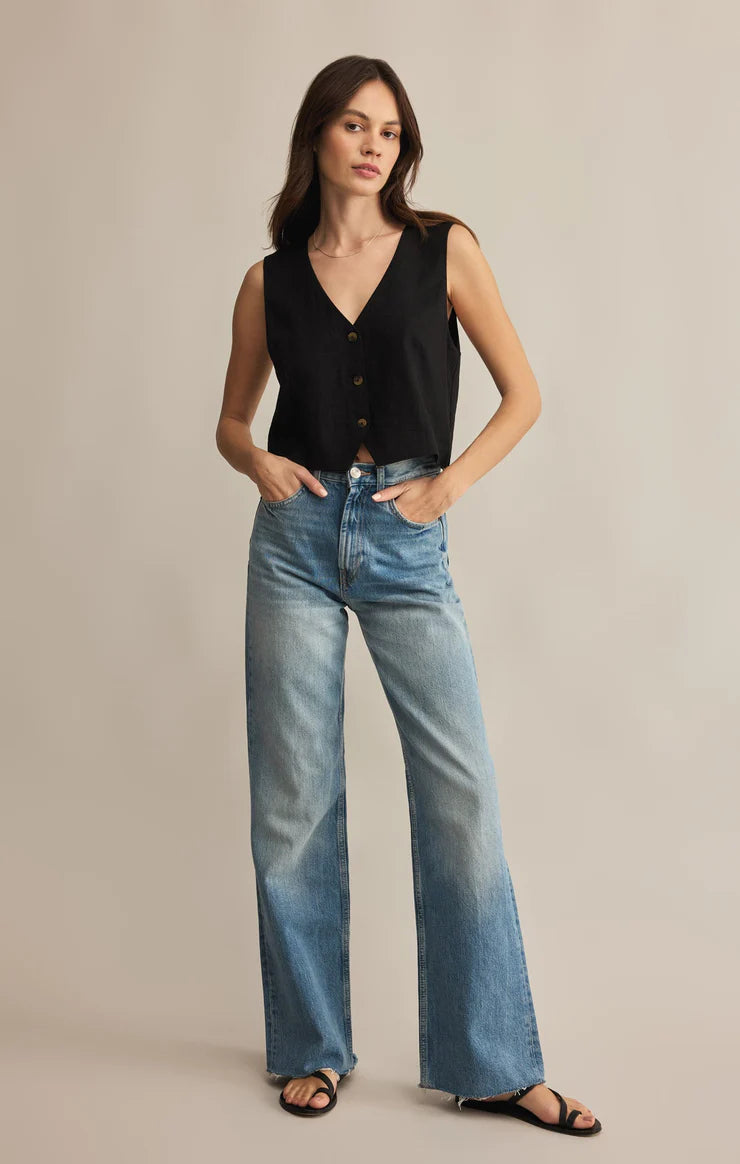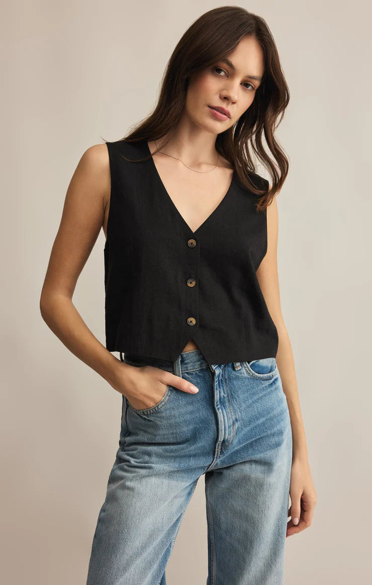Tailored yet relaxed, this fitted linen vest is the perfect layering piece with a polished edge. Fully lined and finished with a button front, it pairs effortlessly with denim or the matching linen bottoms for a set you’ll live in.