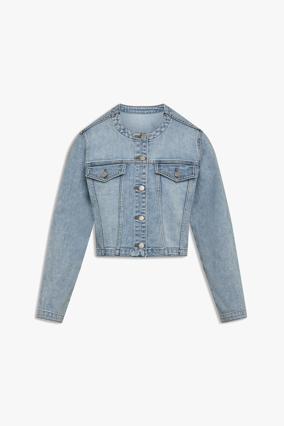 Designed without a collar for a clean, minimalist look, this jacket features a button-down front, chest pockets, and a relaxed fit that's perfect for layering. Its light denim wash provides a comfortable and versatile option for any season.
