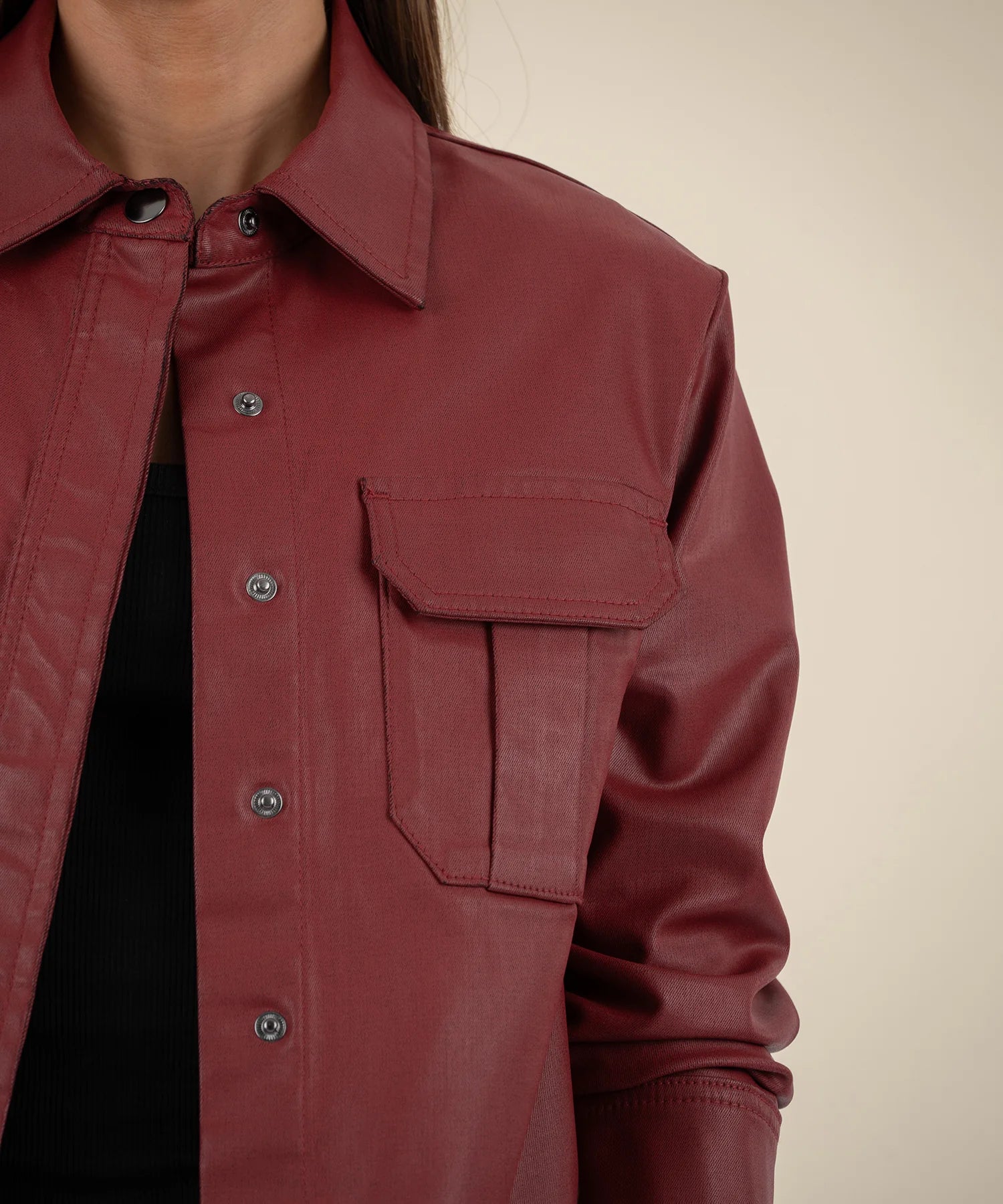 This coated jacket blends utility and edge, featuring patch pockets with flaps, a classic button front closure, and a sleek coated material finish. A versatile outer layer that adds structure and shine to any look.