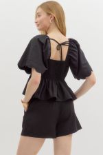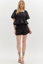 Get in touch with your playful side with our Scarlett Top! This babydoll pullover top features solid elasticated shoulder short sleeves, a scallop hem, and a smocked back tie closure. And who can forget the adorable bow tie keyhole at the front? Be the center of attention with this quirky and fun top.