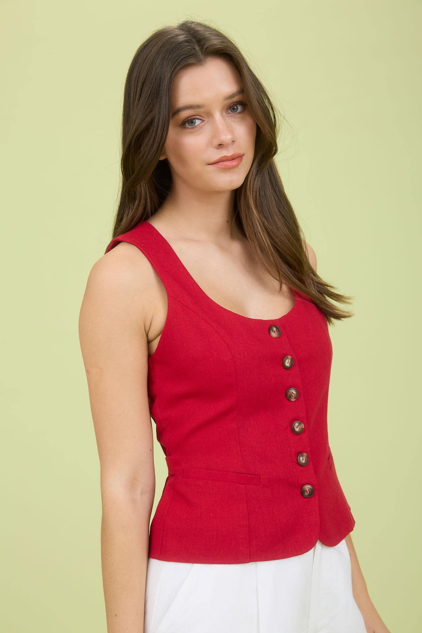The Siren Tank is your new go-to for sunny days and breezy vibes. This sleeveless linen top features a flattering scoop neck and playful button-down front, combining comfort with effortless style. Perfect for layering or wearing solo, it’s light, airy, and ready to turn heads wherever you go.