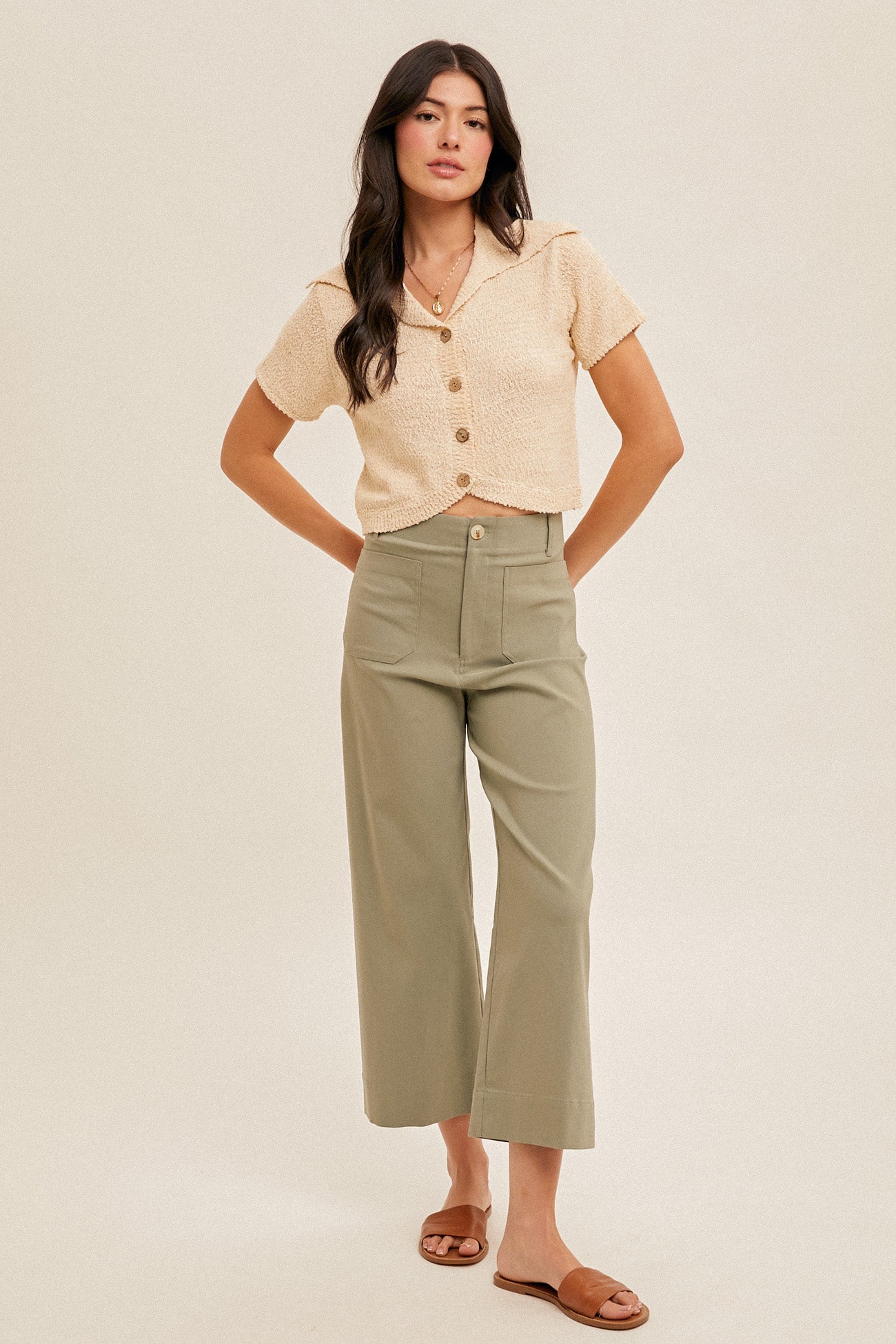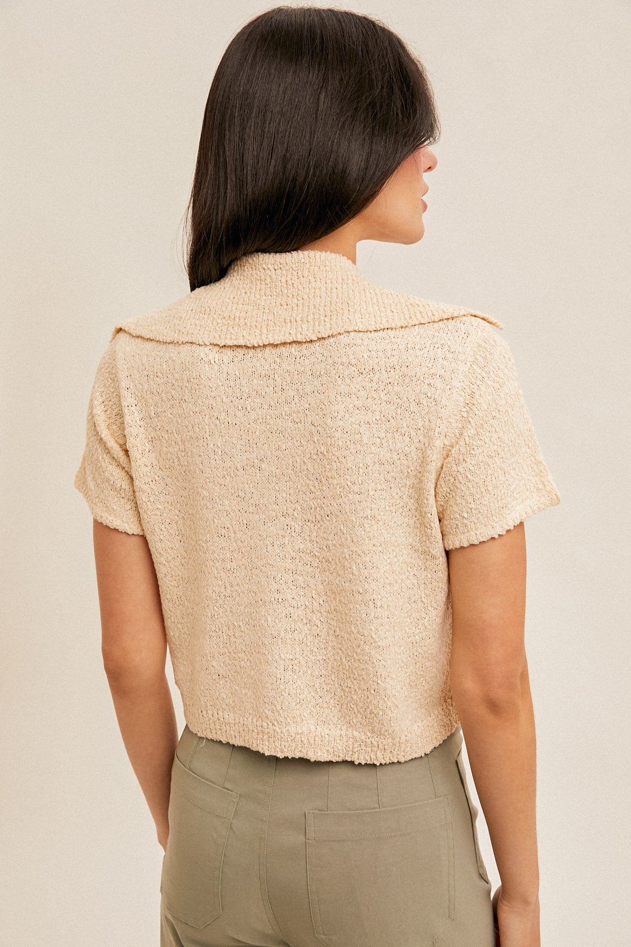 Button front short sleeve sailor collared cardigan in a natural and neutral color for easy styling.
